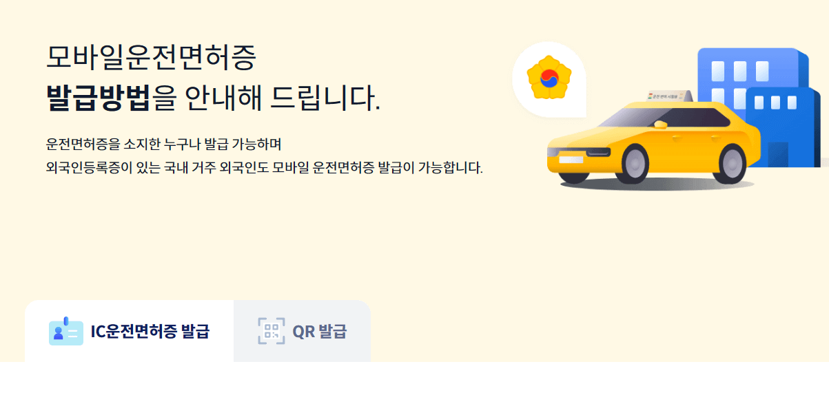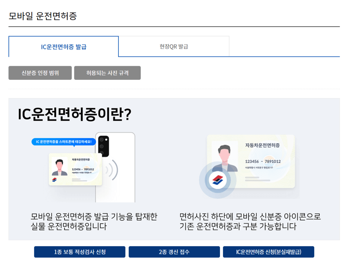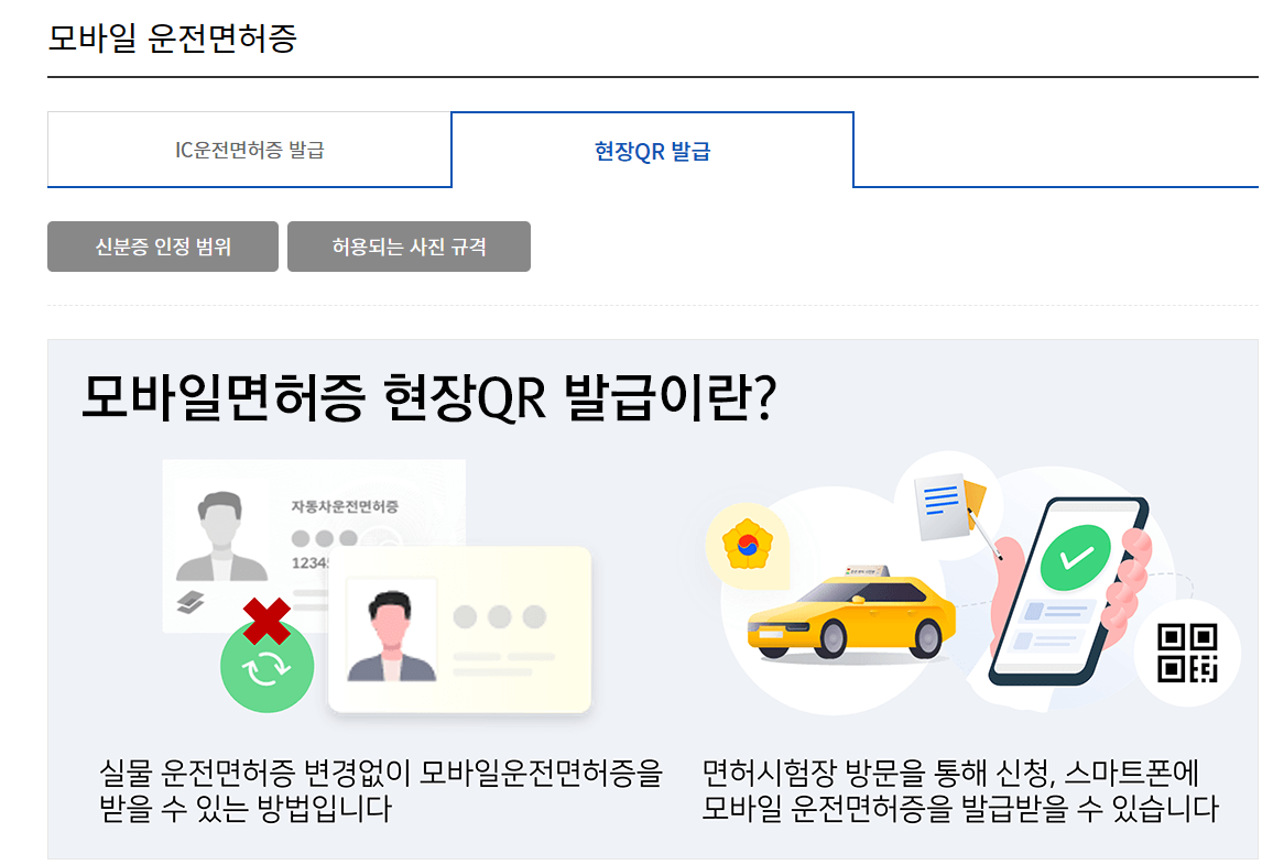 첫 번째는 IC운전면허증 발급 후 모바일 운전면허증을 발급받는 방식이며 두 번째는 전국 면허시험장 방문을 하여 QR코드 발급 후 스마트폰으로 모바일 운전면허증을 발급받는 방식이 있습니다.