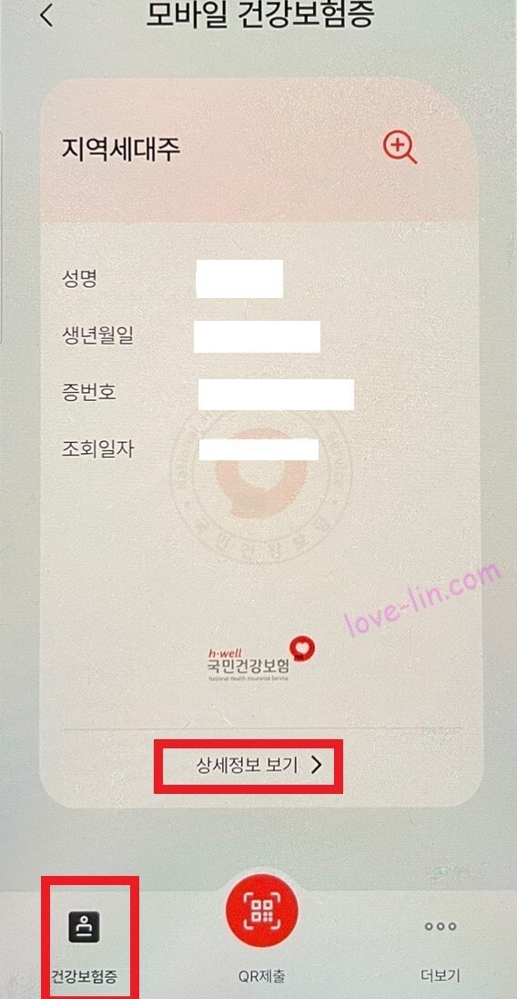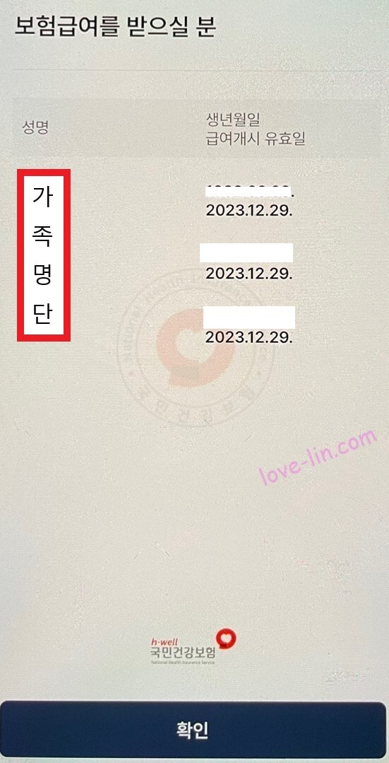 가족들의 명단은 왼쪽 하단 건강보험증을 누르고 상세정보 보기를 선택하면 아래 사진처럼 가족들의 명단과 생년월일등 정보를 확인할 수 있습니다.