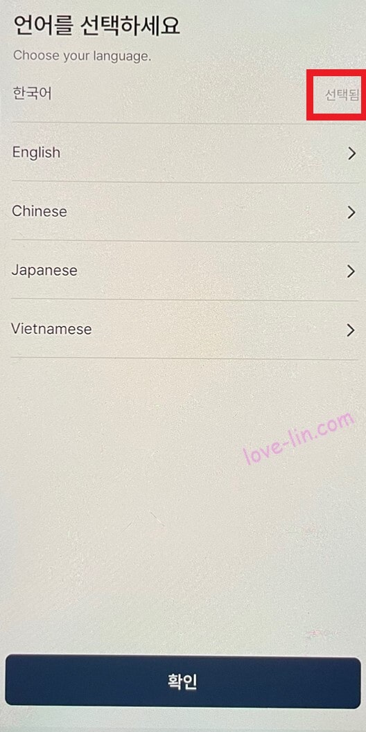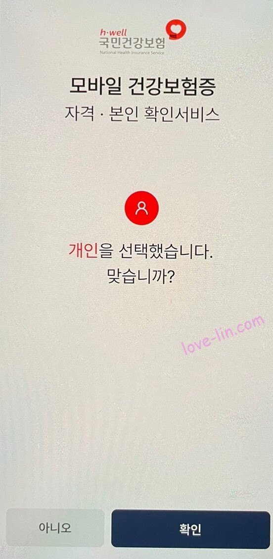검색 후 설치를 하면 최초 화면에 개인 또는 요양기관 중 개인을 선택하며 언어선택화면에서는 기본으로 설정된 언어가 한국어인지 확인합니다.
