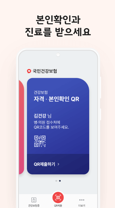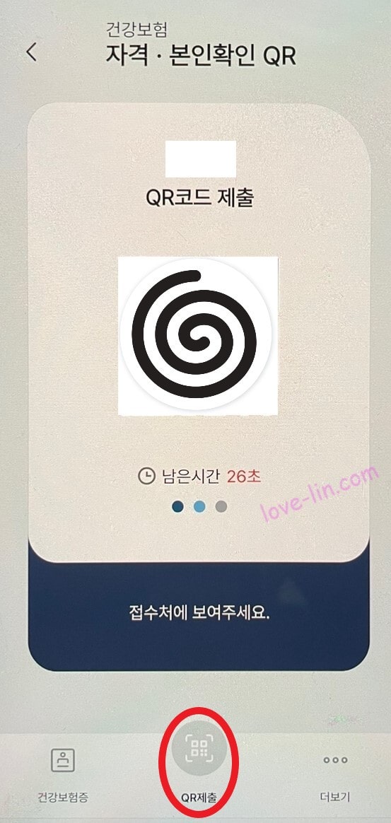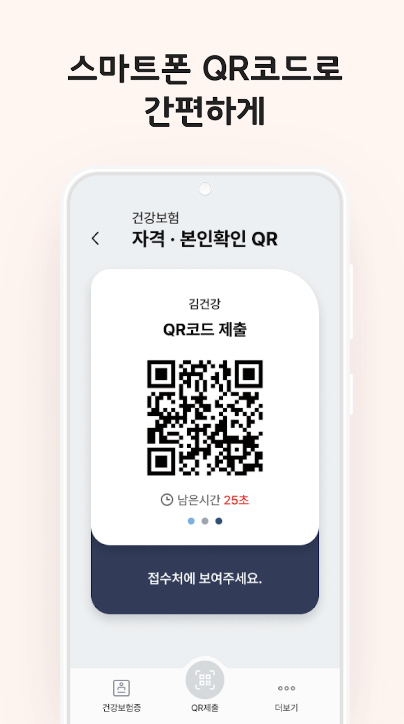 모바일 건강보험증 어플을 열면 화면 중앙아랫부분에 QR 제출이라고 있습니다. 해당 QR제출 버튼을 눌러 확인시켜 주면 끝!!!