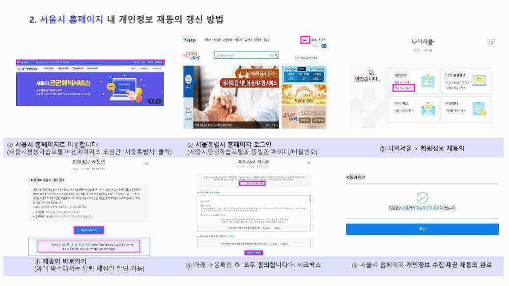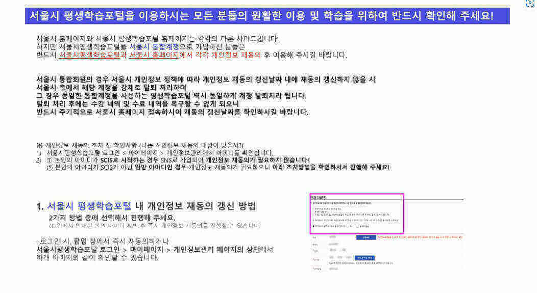 두 번째로는 개인정보 재동의를 갱신하셔야 합니다. 서울시홈페이지와 서울시 평생학습포털 홈페이지는 각각 다른 사이트 이기 때문에 서울시 통합계정으로 가입하신 분들은 꼭 서울시 평생학습포털과 서울시 홈페이지에 각각 개인정보 재동의를 하셔야 합니다.