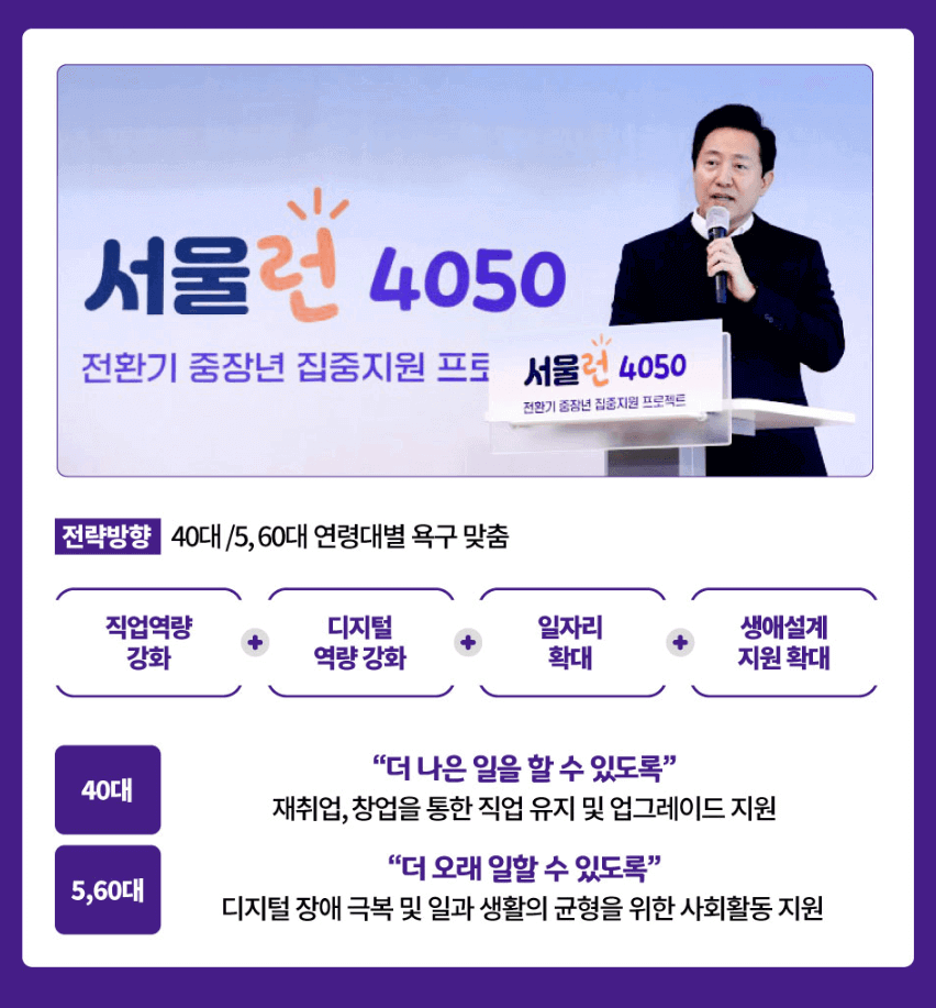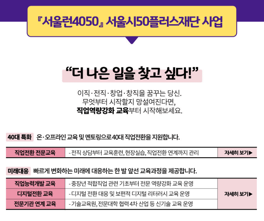서울시에서 운영 중이었던 평생학습포털 시스템을 업그레이드하여 중장년들의 전직 또는 직업훈련 프로그램을 서울런 4050으로 변경하여 23년 3월부터 제공하고 있는 서비스입니다. 온, 오프라인으로 각종 자격증과 취업에 관련된 교육프로그램을 무료로 수강 및 직업에 대한 컨설팅과 상담까지 받을 수 있으며 직업훈련 장학금까지 지원해 주는 복지 제도입니다.