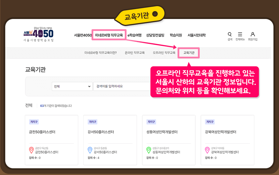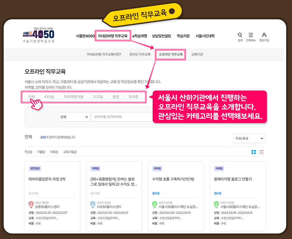 아래 바로가기를 누르시면 서울 4050 홈페이지가 나옵니다. 해당 홈페이지에서 원하시는 강의 신청 및 수강을 하시면 되고 특히 회원가입 없이 수강은 가능하지만 각종 자격증 및 수료증을 발부받으시려면 회원가입 후 원하시는 강의를 수강신청하셔야 합니다. ***학습이력을 통해서 개인별 맞춤상담 및 관리가 되기 때문에 꼭 회원가입하셔야 합니다.***